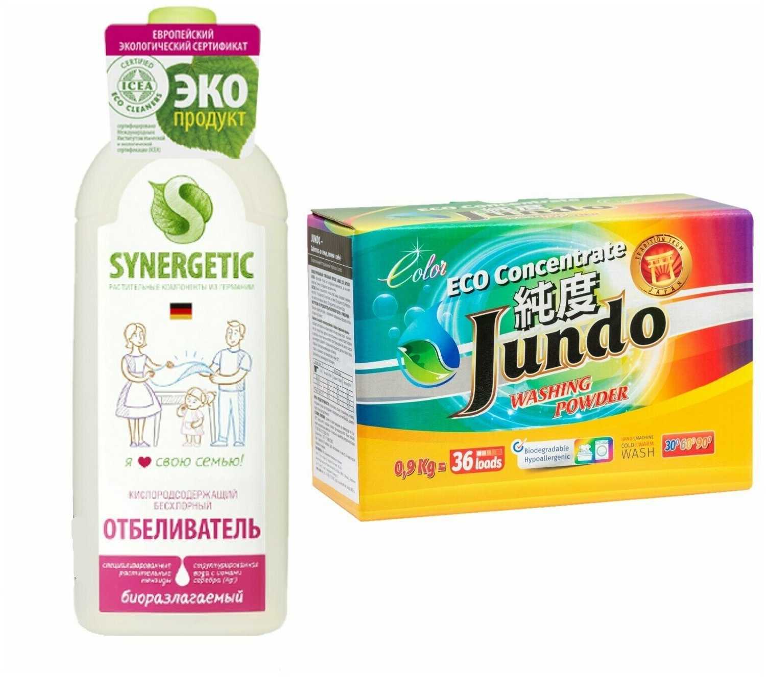 6.4/10 балловSynergetic Кислородный отбеливатель для белья, флакон-дозатор, 1 л + Jundo «Color» Экологичнный концентрированный порошок для стирки Цветного белья (36 стирок), 900 гр