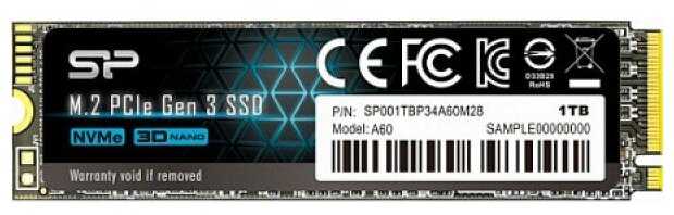 Silicon Power 1.0 Tb A60 (PCI-E 3.0 х4, до 2200/1600 Мбит / с, 250000 IOPs, 3D TLC, NVMe 1.3, 600TBW, 22х80мм)