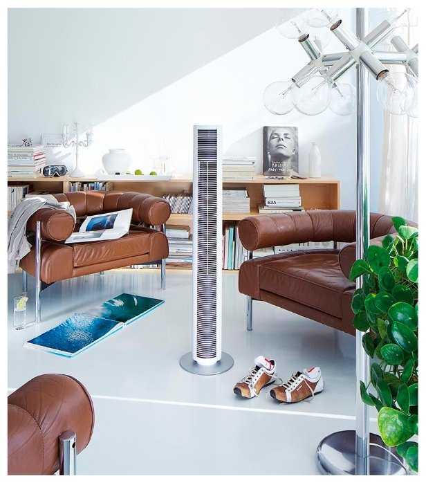 - + Дизайн отличный. Тихая работа. В наличии фильтр сеточка сзади. Неплохо продувает помещение на 1 скорости. Достаточно высокий. Управление на верхнем торце. Пультом не пользуюсь. И так удобно. Наклоняться не надо.