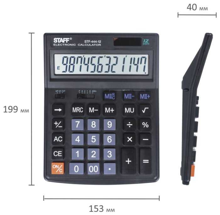 Нужно было купить калькулятор для ОГЭ, если честно, не выбирала, а просто зашла в магазин и купила первый попавшийся, а именно STAFF STF-444-12 (199x153мм) . Осталась очень довольна. В комплекте была инструкция. Калькулятор бюджетный, лёгкий и компактный. Советую.