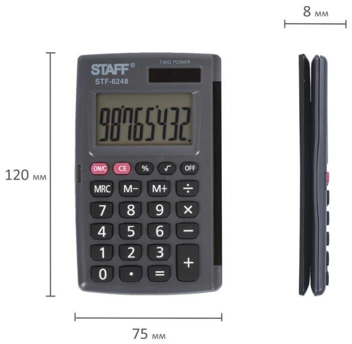 | Подробная комплектация : | Калькулятор карманный STAFF STF-6248 (104х63 мм), 8 разрядов, двойное питание |