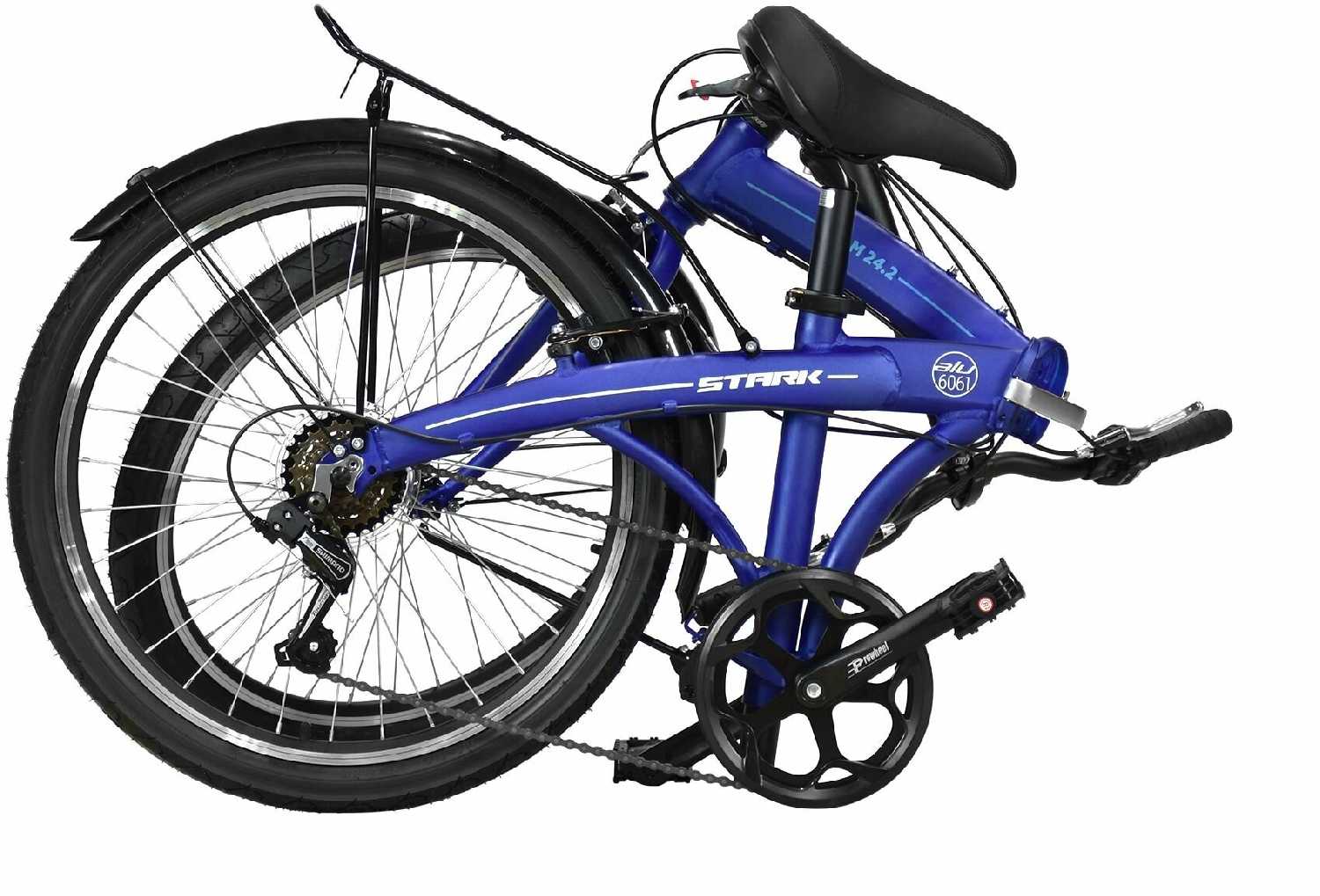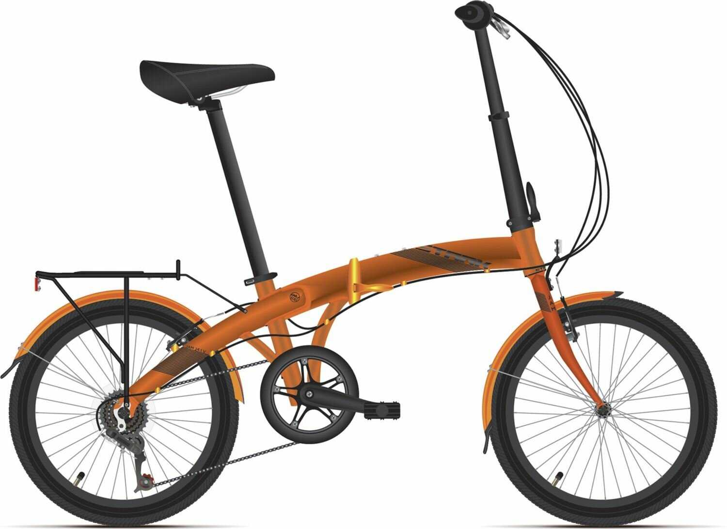 - + Прочный, алюминиевая рама неплохо покрашена, быстро складывается, подойдёт для рослого человека ( до 185 см). В принципе, если докупить подседельный штырь подлиннее, то можно ездить и с 185+. Высоты руля хватает