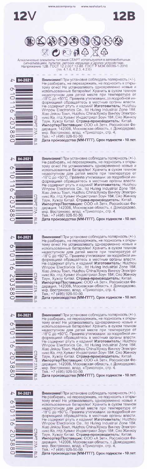 36 отзывов пользователей o СТАРТ Батарейки старт 27А (MN27), 5 шт.