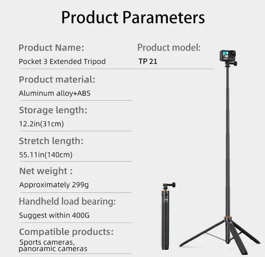 | Комплектация : | Телескопический штатив extension selfie stick для DJI Pocket 3/ Insta360/ GoPro TP-21 (31-138см) |