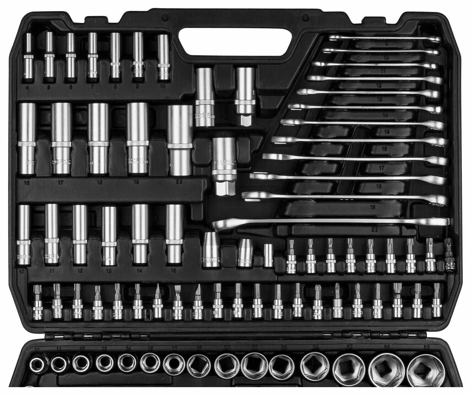 | Головки торцевые подробно : | 1/4": 4 4.5 5 5.5 6 7 8 9 10 мм, 1/4": E4 E5 E6 E7 E8, 3/8": 6 7 8 9 10 11 12 13 14 15 17 18 19 21 22 мм, Головка торцевая 1/2": 8 10 12 13 14 15 16 17 18 19 20 21 22 23 24 25 27 30 32 мм, Головка торцевая 1/2": E10 E12 E14 E16 E20 |