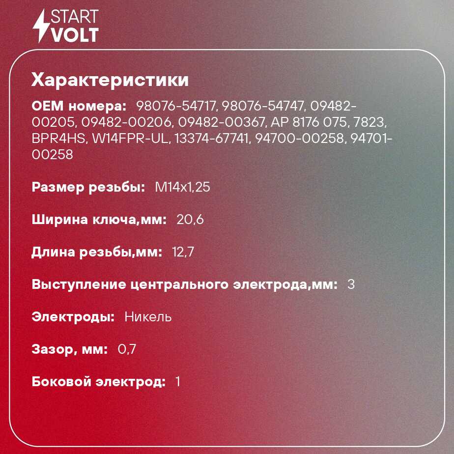 Характеристи СтартВОЛЬТ Свеча зажигания BPR4HS (3575)