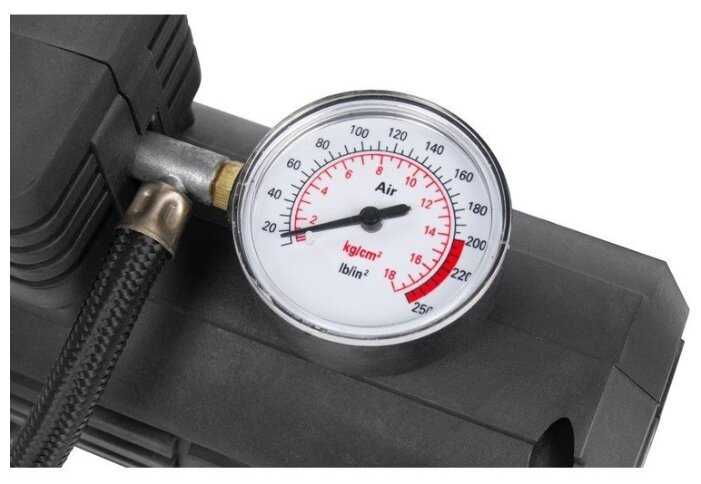 - + Легко справляется с автомобильной шиной 16R, очень пригодился для подкачки футбольного мяча с учётом имеющейся насадки и колёс коляски, свою стоимость отрабатывает