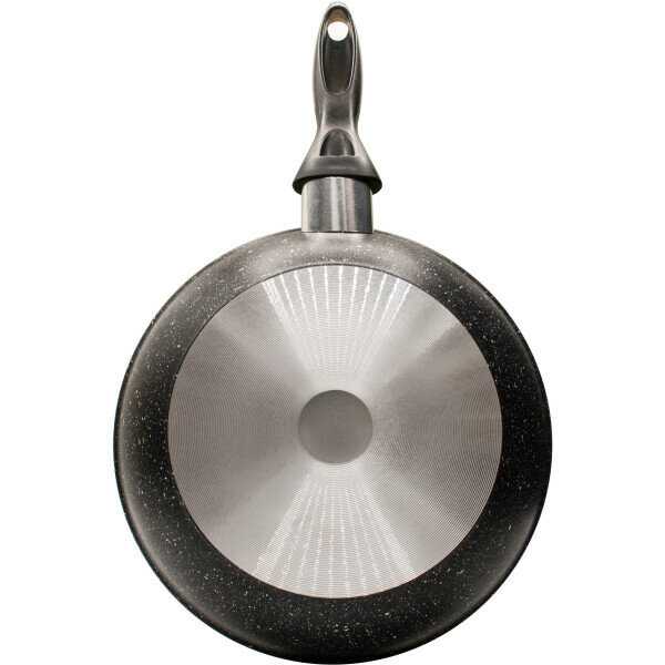Благодаря материалу изготовления – литому алюминию – и утолщенному дну, сковорода обеспечивает равномерный прогрев по всей поверхности. Это подтверждается в отзывах, где пользователи подчеркивают отсутствие "слепых" холодных зон, что способствует одинаковой прожарке продуктов. Такая конструкция также способствует быстрому начальному разогреву и стабильному удержанию температуры в процессе готовки. В результате блюда готовятся равномерно, без подгорания в центре или недожара по краям. -