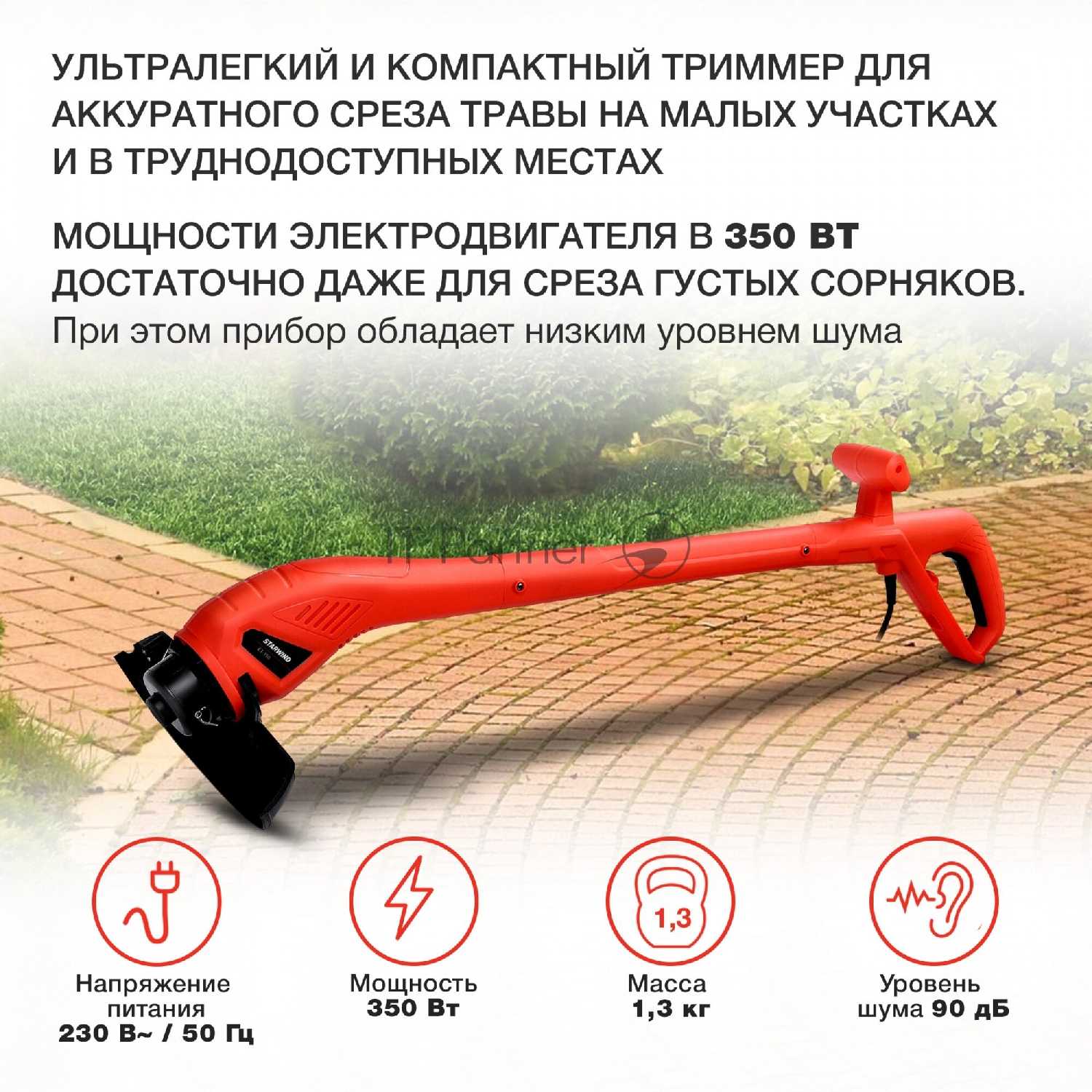 - + Я полностью доволен триммером ET-350. С его мощностью Вт легко обрезаю газон вокруг плитки, убираю траву у собаки или вокруг кустов и деревьев. Вес всего 1.3 кг делает его удобным и портативным, вот это большой плюс, если нужно отвезти триммер к теще.