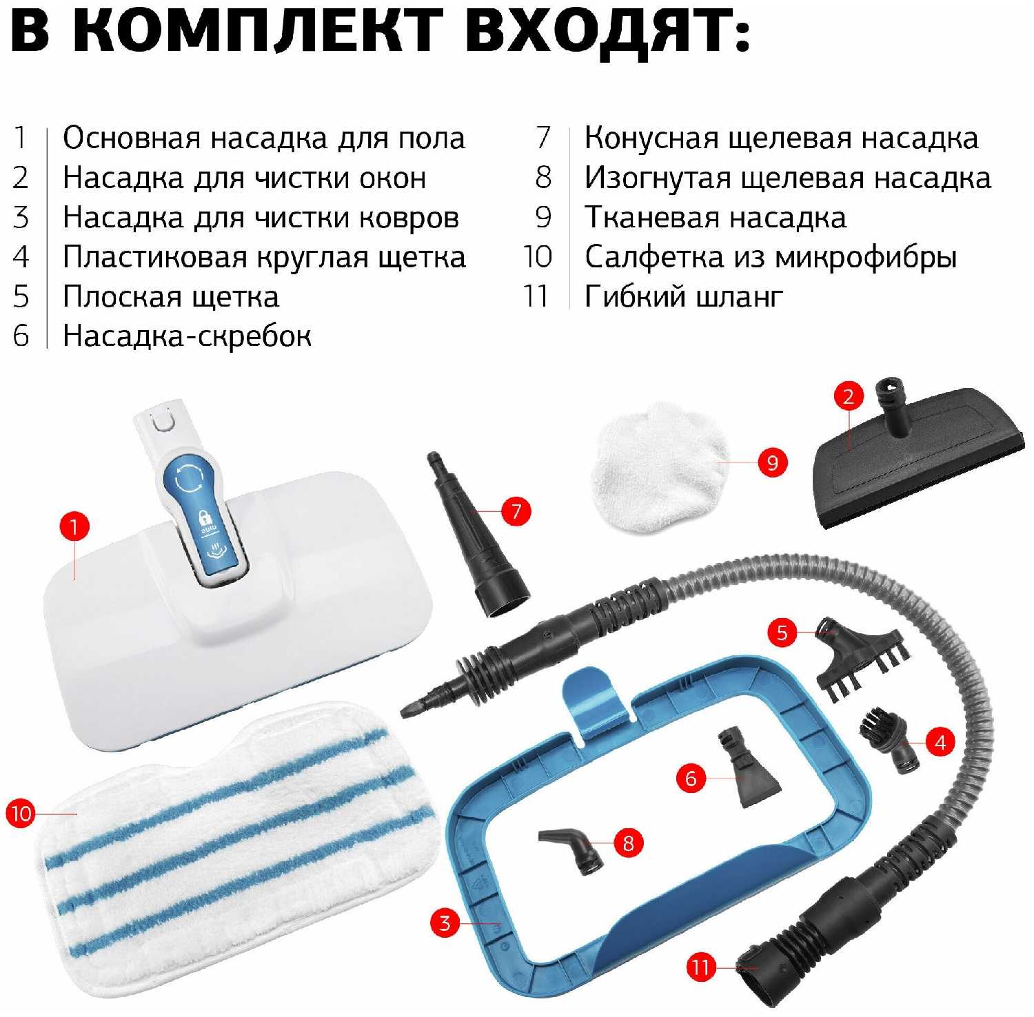 - 10+ насадок в комплекте: для окон, ковров, щелей, мягкой мебели. Например, узкая щелевая насадка эффективна для обработки межплиточных швов.