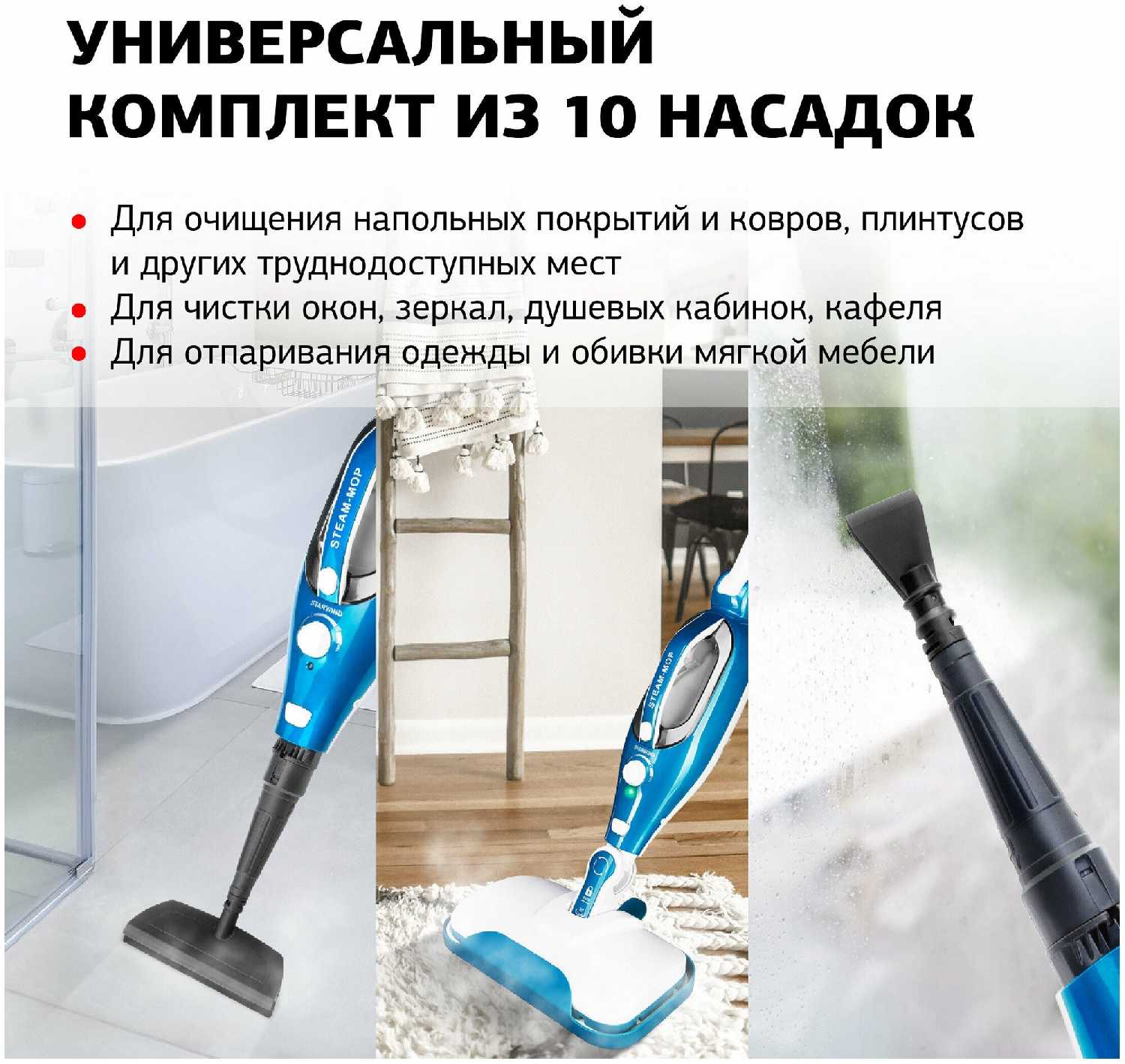 Из плюсов: качественные материалы, быстрый разогрев, хорошо справляется со своими функциями, ламинат высыхает быстрее, чем после мытья обычной шваброй. Очень привлекательная цена. Попробовала насадку для ковров, очень легко двигается с ней по ковролину. Куплю маме такую, у нее ковры в квартире. Ну и просьба к производителям выпустить в продажу доп.гасадки для швабры