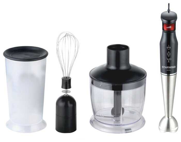 - В комплекте венчик для взбивания теста и кремов, измельчитель для мяса, орехов, овощей, мерный стакан с крышкой.