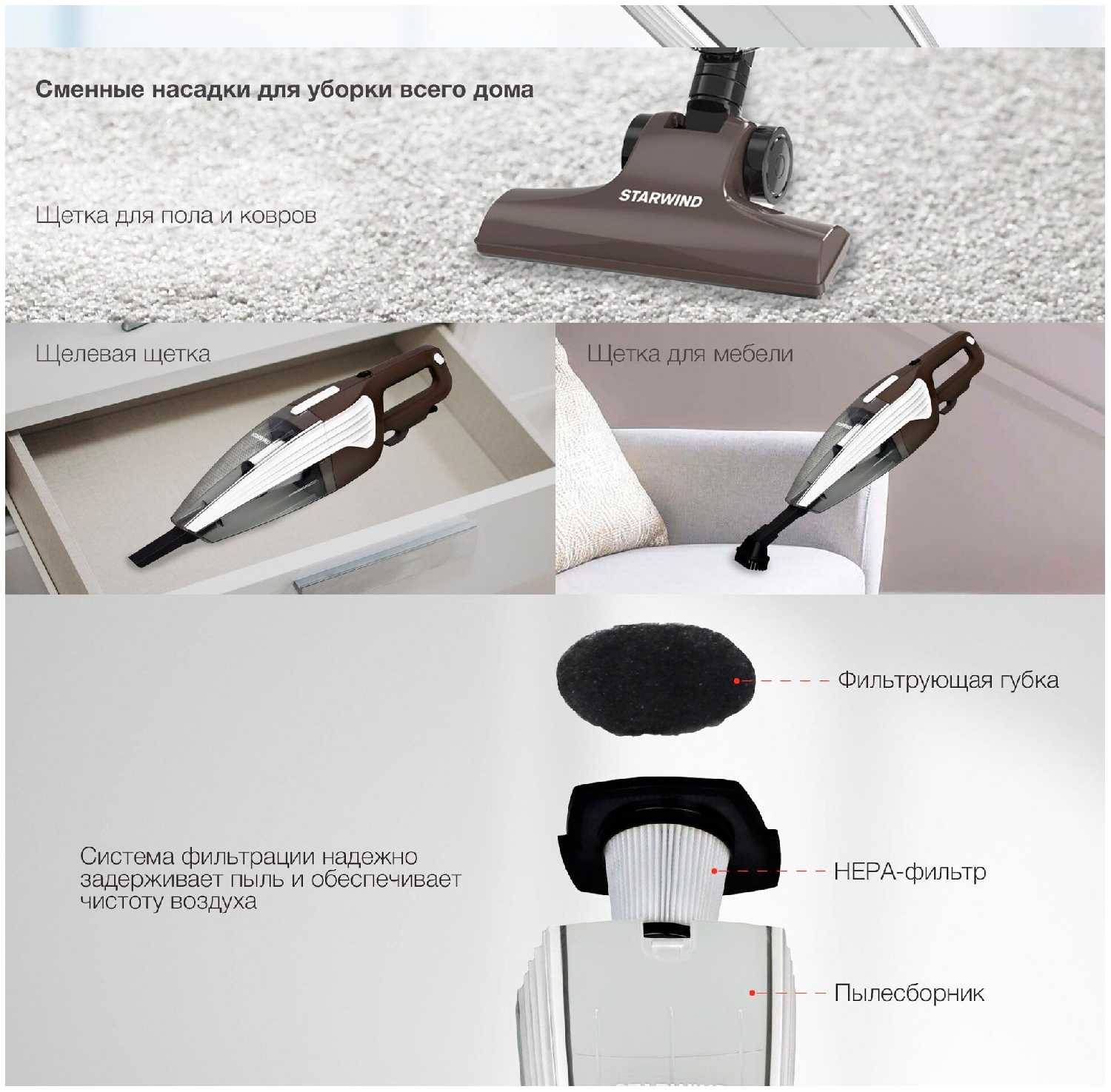 Стандартная комплектация включает основную щетку для пола/ковров (с переключателем ворса), узкую щелевую насадку и мини-турбощетку для мебели. Последняя особенно эффективна для чистки диванов, подушек и автомобильных сидений. Некоторые пользователи считают основную щетку неудобной из-за отсутствия щетины по краям, что затрудняет сбор мусора у плинтусов. -