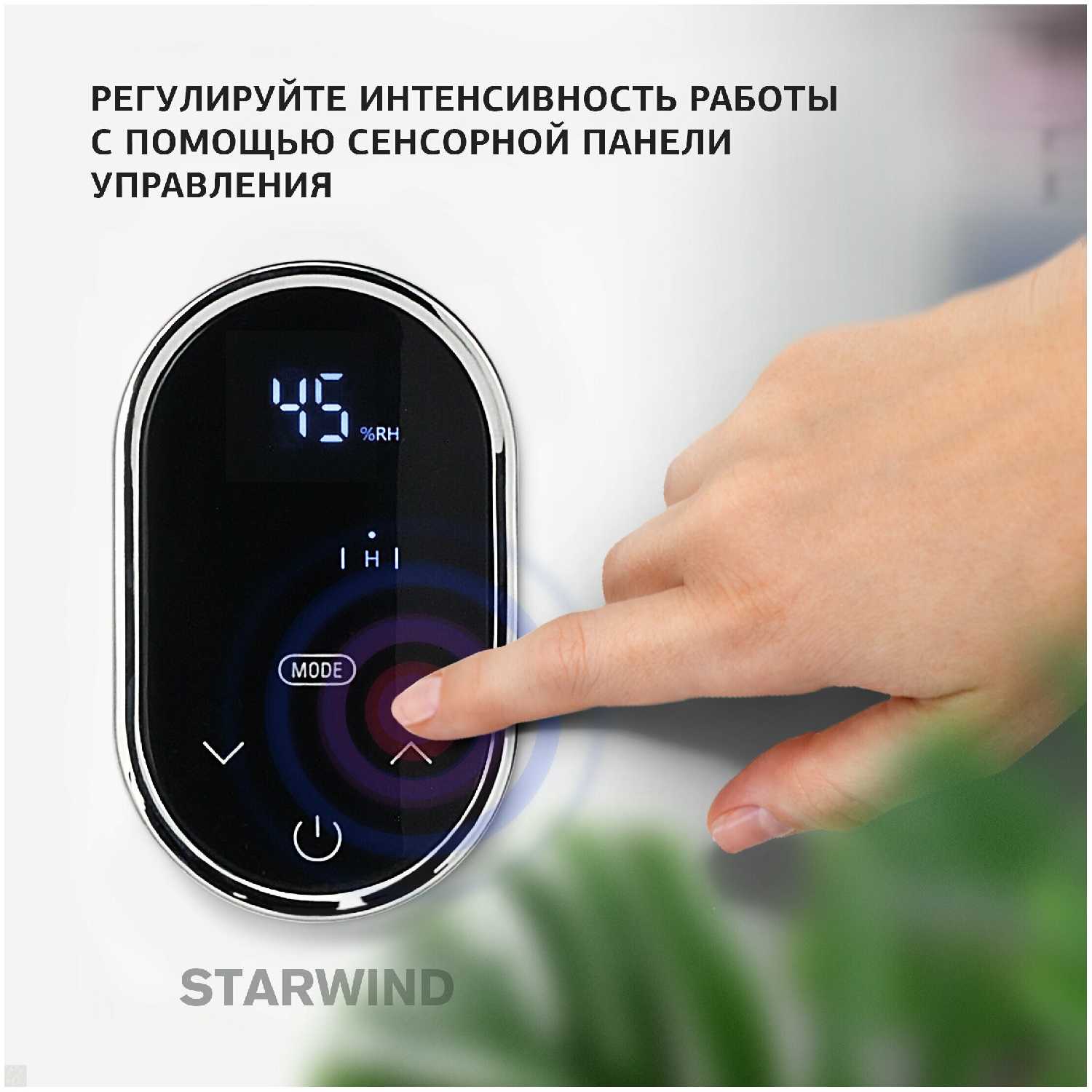 - Интуитивная панель с дисплеем отображает текущую влажность, выбранный режим и уровень воды.