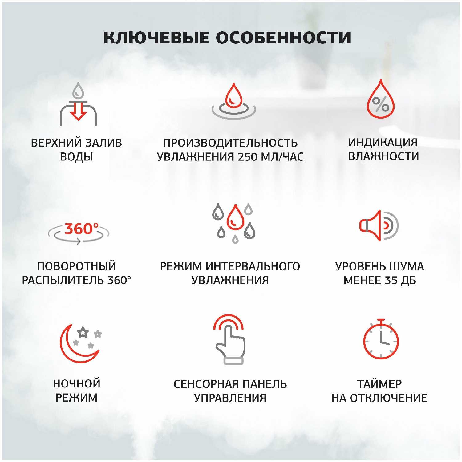 - Потребление 25 Вт/час делает увлажнитель экономичным для круглосуточной работы.
