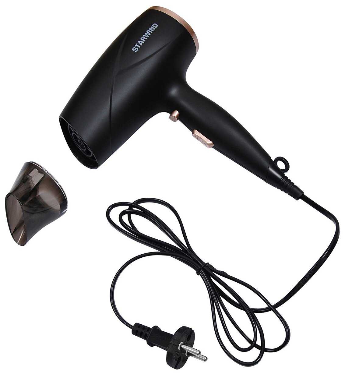 - + Мощный, при том что компактный и лёгкий. три температурных режима, две скорости, чёрного цвета. С петлёй для подвешивания. длинный кабель, без малого 2 м