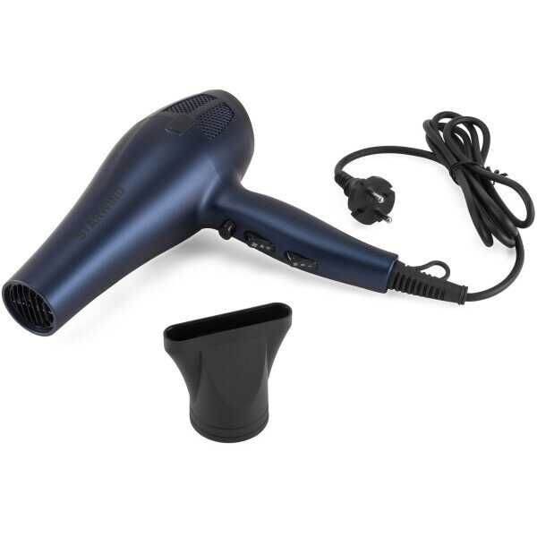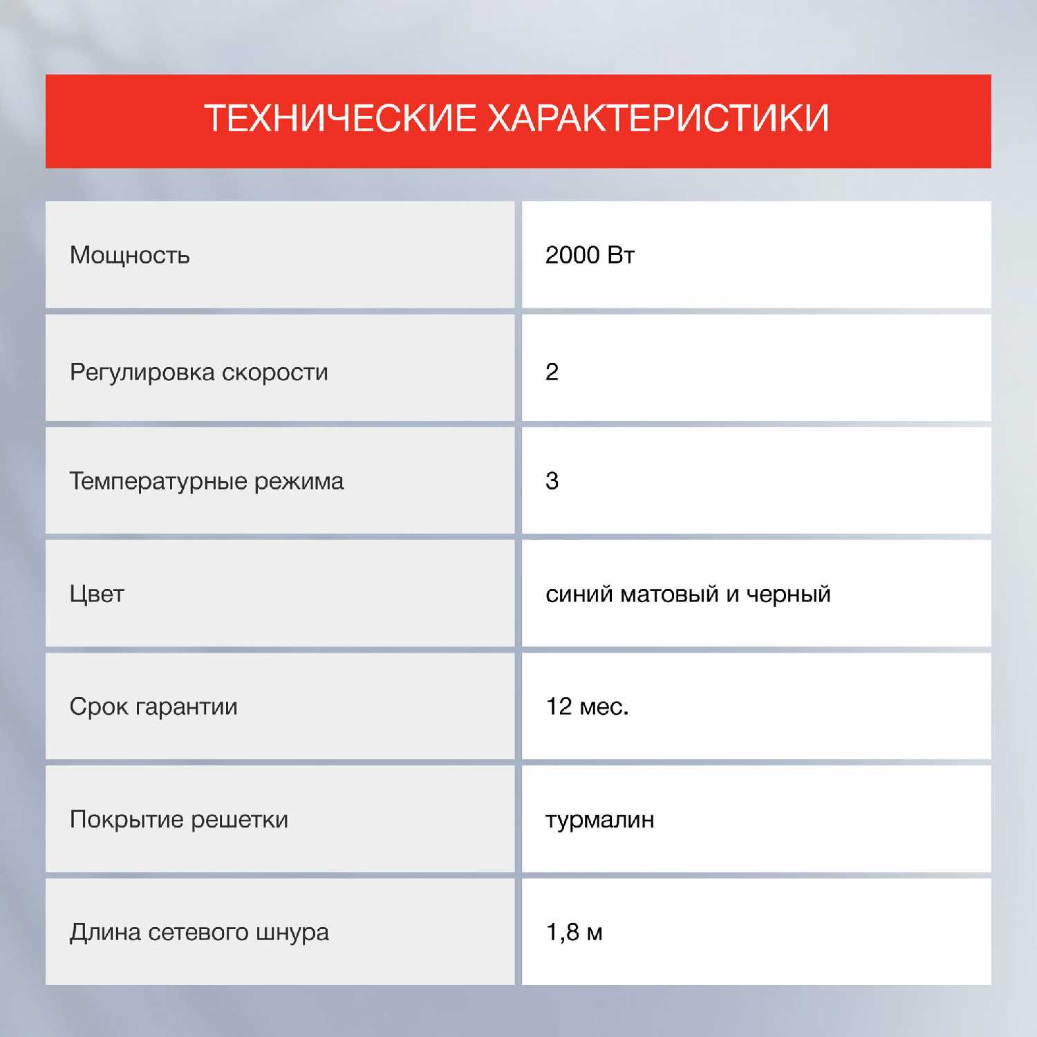- Мощность 2000-2200 Вт обеспечивает быструю сушку даже длинных и густых волос, сокращая время процедуры до 5-15 минут.