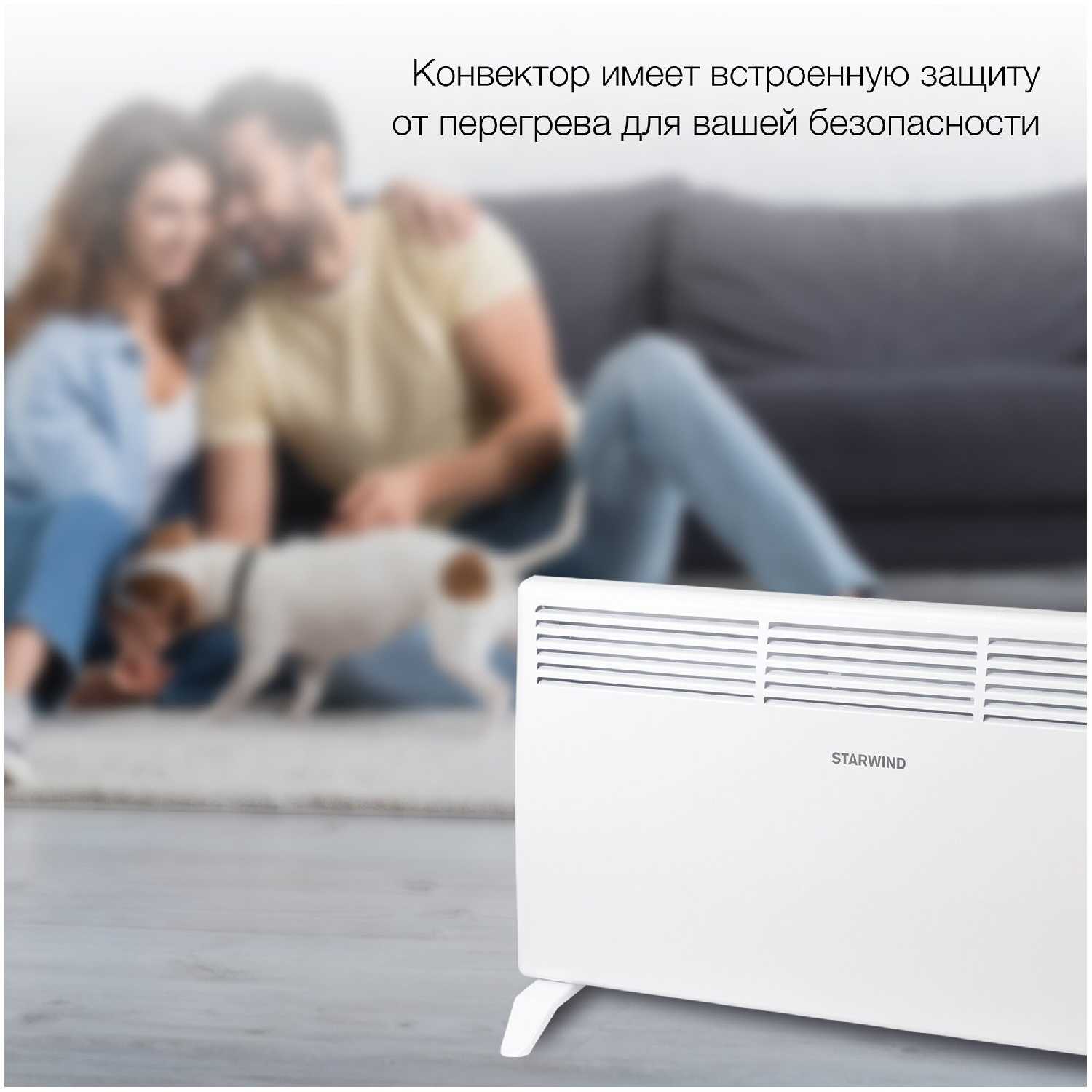 Устройство оснащено двумя системами безопасности: защитой от перегрева (автоматическое отключение при критическом нагреве) и датчиком опрокидывания. Пользователи подтверждают, что корпус не нагревается до опасных температур даже при длительной работе, что позволяет оставлять конвектор без присмотра на ограниченное время. -