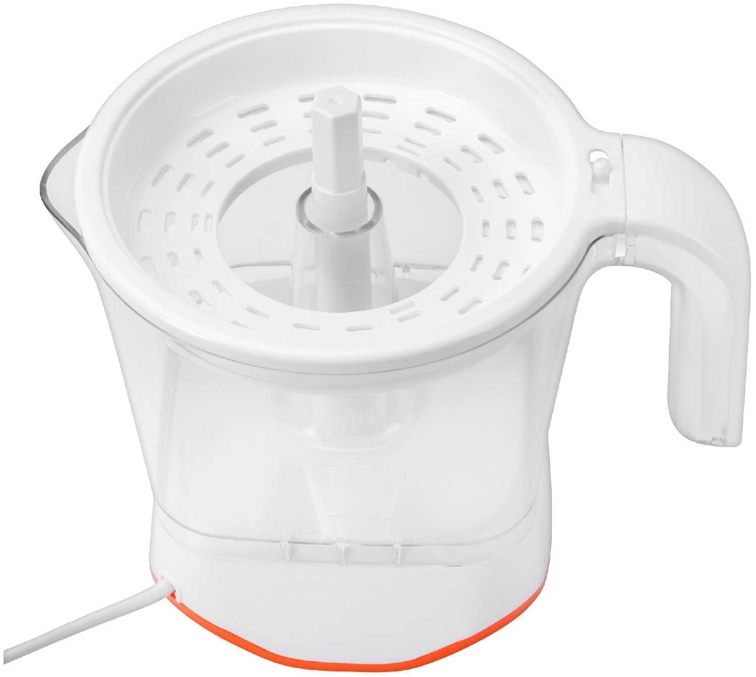 - + Прочный пластик корпуса обеспечивает долговечность. Вместительный резервуар позволяет делать сок для всей семьи за один раз.