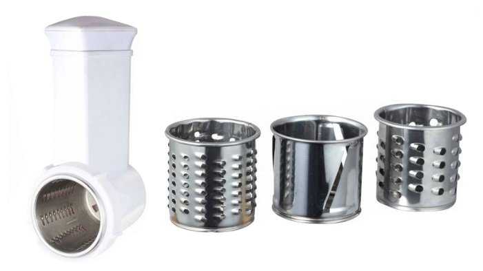 - Мясорубка справляется не только с мясом, но и с овощами, тестом, колбасами, а также шинковкой и тёркой благодаря комплекту насадок.