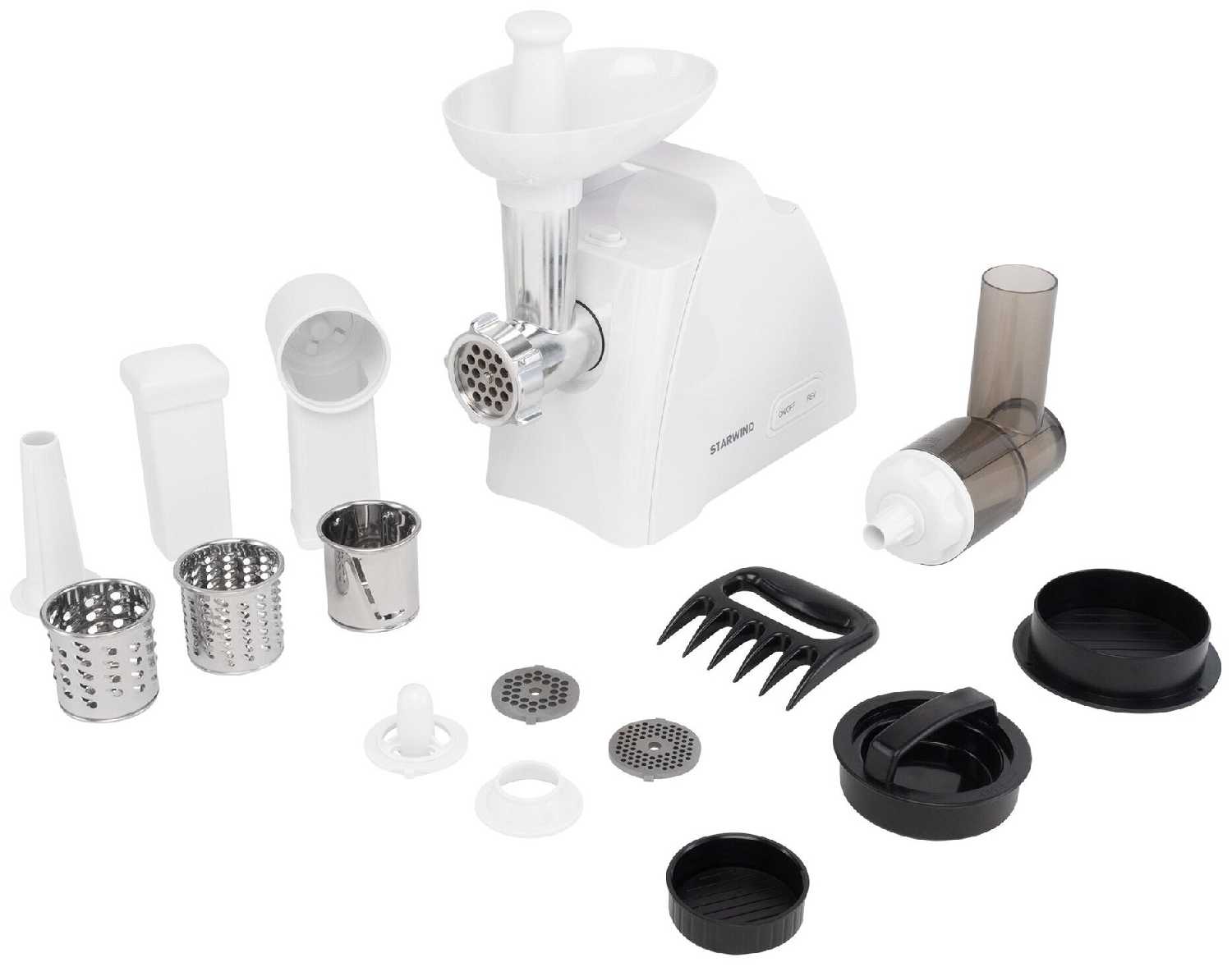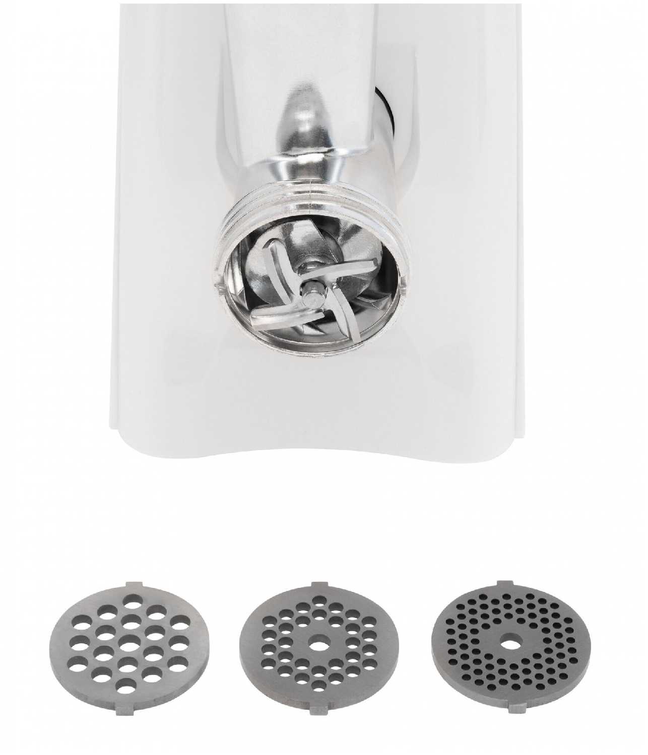 - В комплекте 3 диска для фарша (от 3 до 7 мм), насадки для колбас, кеббе, шинковки овощей, соковыжималка и пресс для котлет.