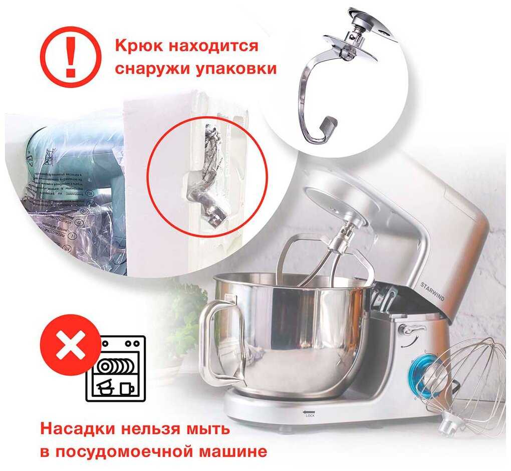1. Миксер приехал через сутки после заказа, упакованный в 2 коробки, типа матрёшки. В идеальном состоянии. Крюк нашла в пенопласте, спасибо отзывам.