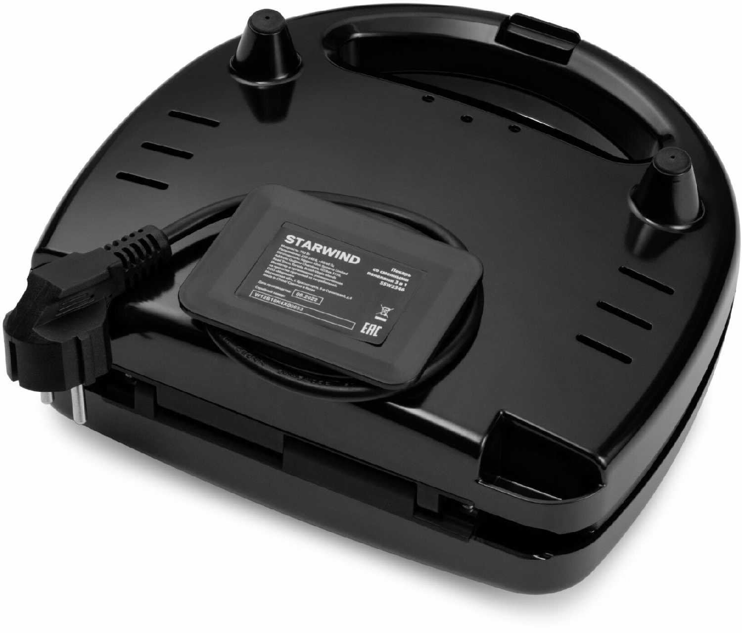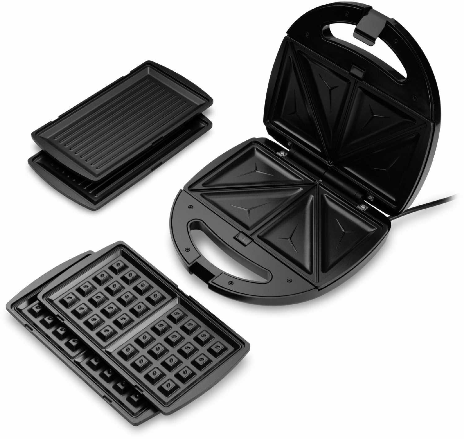 - В комплекте панели для сэндвичей, вафель и гриля, что позволяет готовить разнообразные блюда (оладьи, мясо, яичницу).