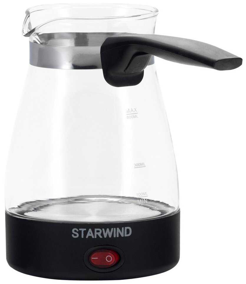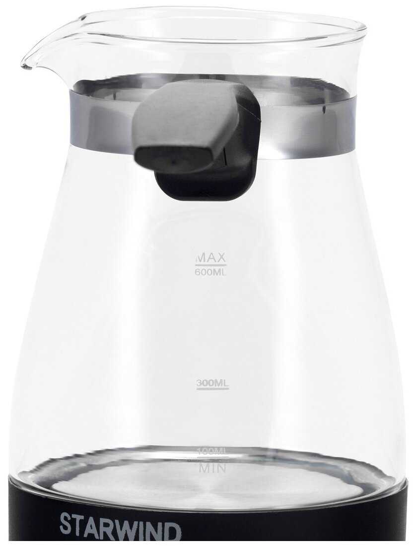 - Мерная шкала на колбе помогает точно дозировать воду, а защита от работы без воды добавляет безопасности.