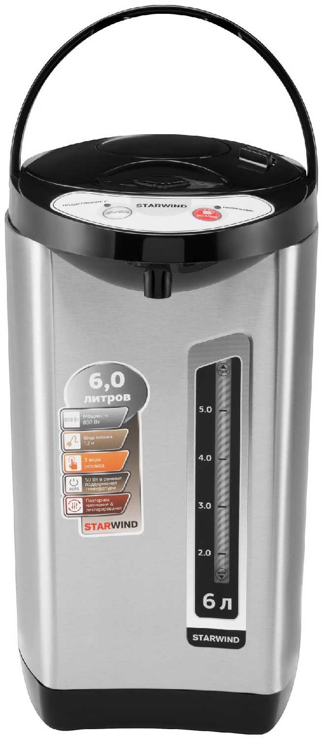 - + Объём 6 литров. Индикатор остатка воды есть на корпусе. Мощность 800 Вт. Два температурных режима. Воду можно налить несколькими способами. Корпус вращается. Есть ручка для переноски.