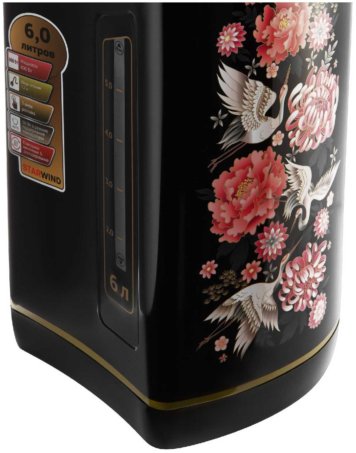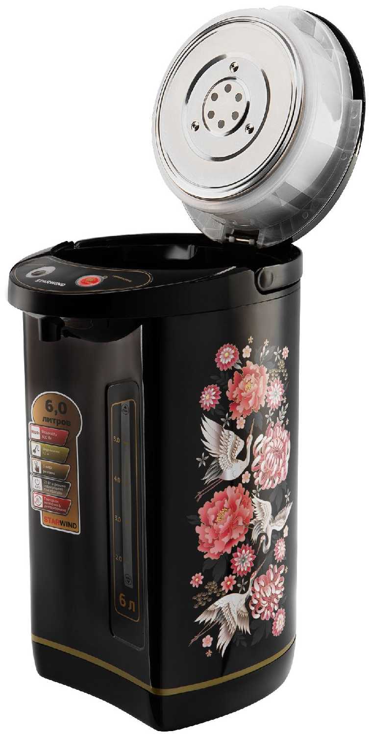 | Особенности : | вращение на 360 градусов, двойные стенки, индикатор уровня воды, индикация включения, рисунок на корпусе, съемная крышка |
