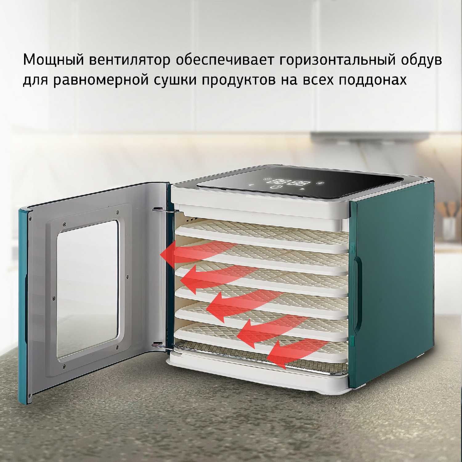 Боковой вентилятор распределяет воздух параллельно поддонам, обеспечивая одинаковое воздействие на все уровни. Это исключает необходимость ручной ротации лотков, характерную для вертикальных моделей. Пользователи отмечают отсутствие "мертвых зон": верхние и нижние ярусы просушиваются идентично. Технология также минимизирует смешивание запахов при одновременной обработке разных продуктов. Результат — равномерно обезвоженные кусочки без пересушенных краев или сырых участков. -