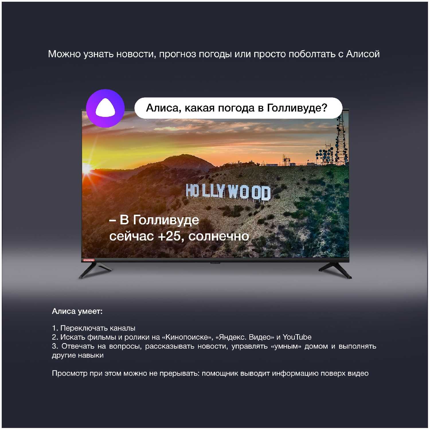 - Голосовой помощник Алиса оперативно выполняет поиск контента и управление базовыми функциями через пульт.