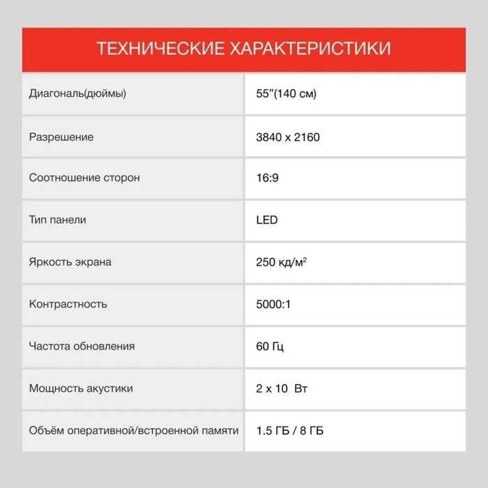 Звук характеризуется как «базовый» для бюджетного сегмента: на средних громкостях (15–25 единиц) он достаточен для кухни или маленькой комнаты, но на высоких (свыше 30) возможны искажения в ВЧ-диапазоне («дребезжание», «плоскость»). Для просмотра фильмов или музыки пользователи настоятельно рекомендуют подключение внешней акустики через Bluetooth или HDMI-ARC, так как физические размеры динамиков (3–5 Вт) ограничивают глубину низких частот. -