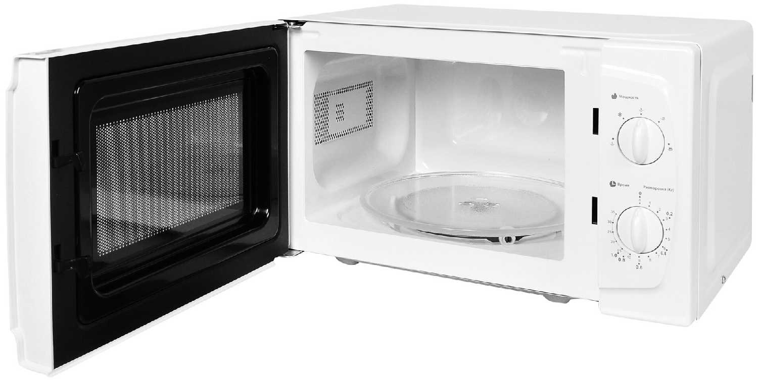 - + Эта микроволновая печь подходит для небольшой семьи, так как она имеет объем 20 л и мощность 700 Вт. Управление печью простое достаточно повернуть два регулятора, чтобы выбрать режим мощности и время разогрева. Печь имеет функции автоматического разогрева и разморозки, что удобно. Корпус печи белого цвета и легко моется.