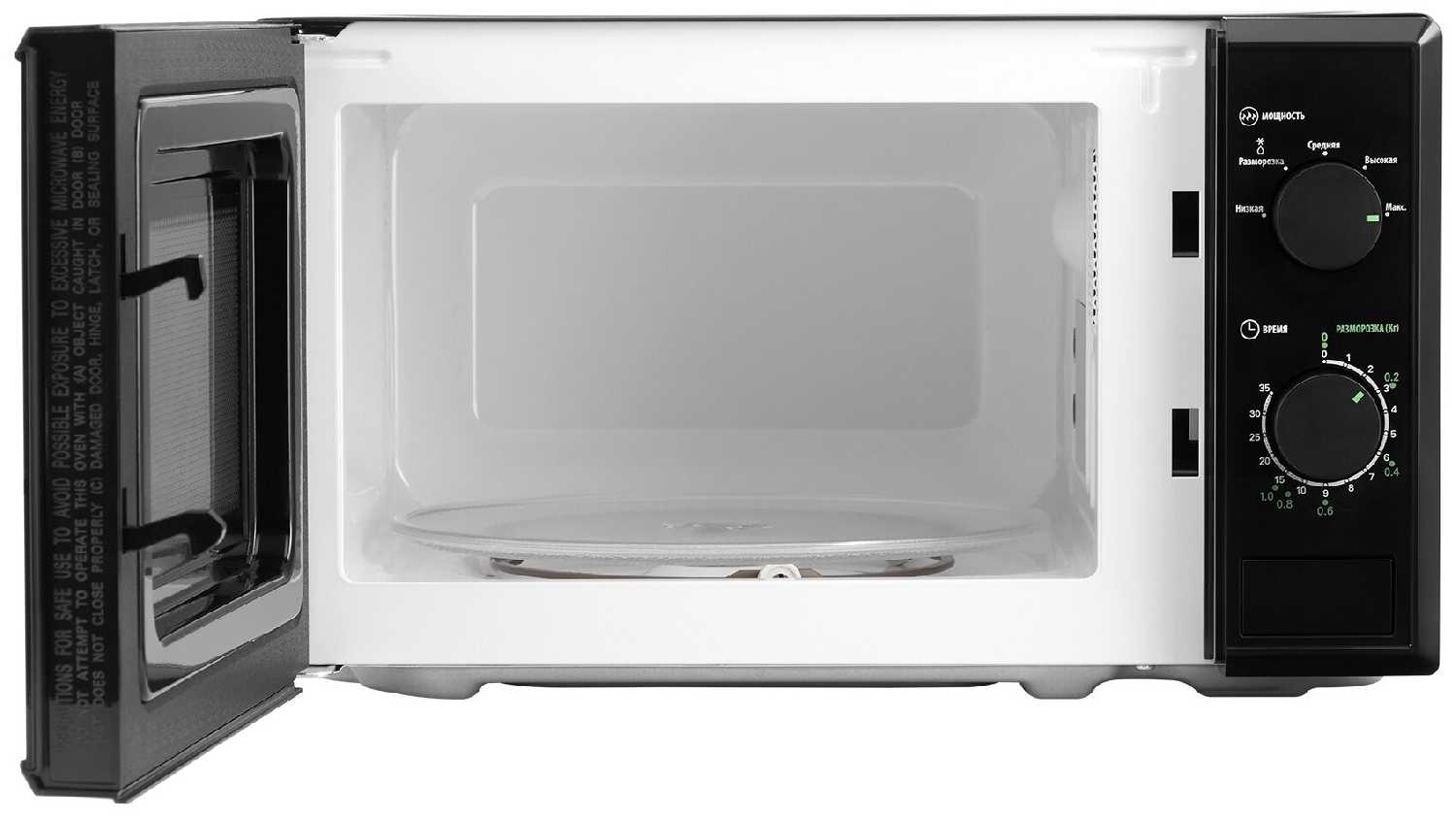 - + Дверца открывается с кнопки, управление механическое, 5 уровней мощности, есть даже функция разморозки, не скажу, что часто пользуюсь, но приятно, что имеется.
