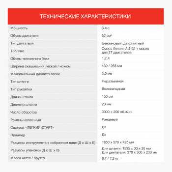 - + Двигатель имеет мощность 3 л.с. Емкость топливного бака 1.2 л. Триммер оснащен полуавтоматической подачей лески и триммерным ножом. Он удобен в использовании благодаря велосипедной рукоятке и ранцевому ремню. Гарантия производителя - 1 год.