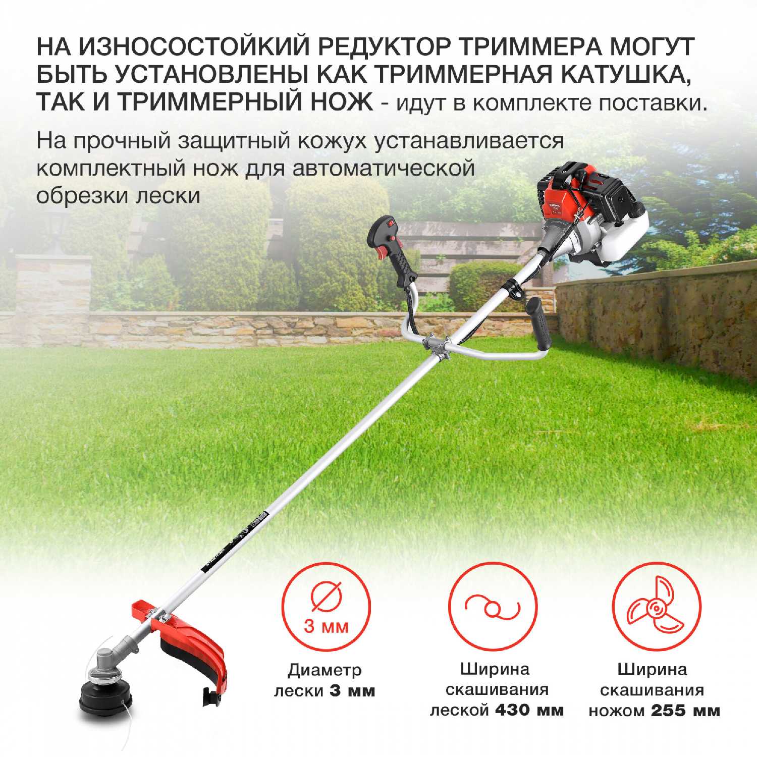 Триммер оснащен режущим элементом леска/нож, шириной скашивания 430/255 мм и подачей лески полуавтоматической.