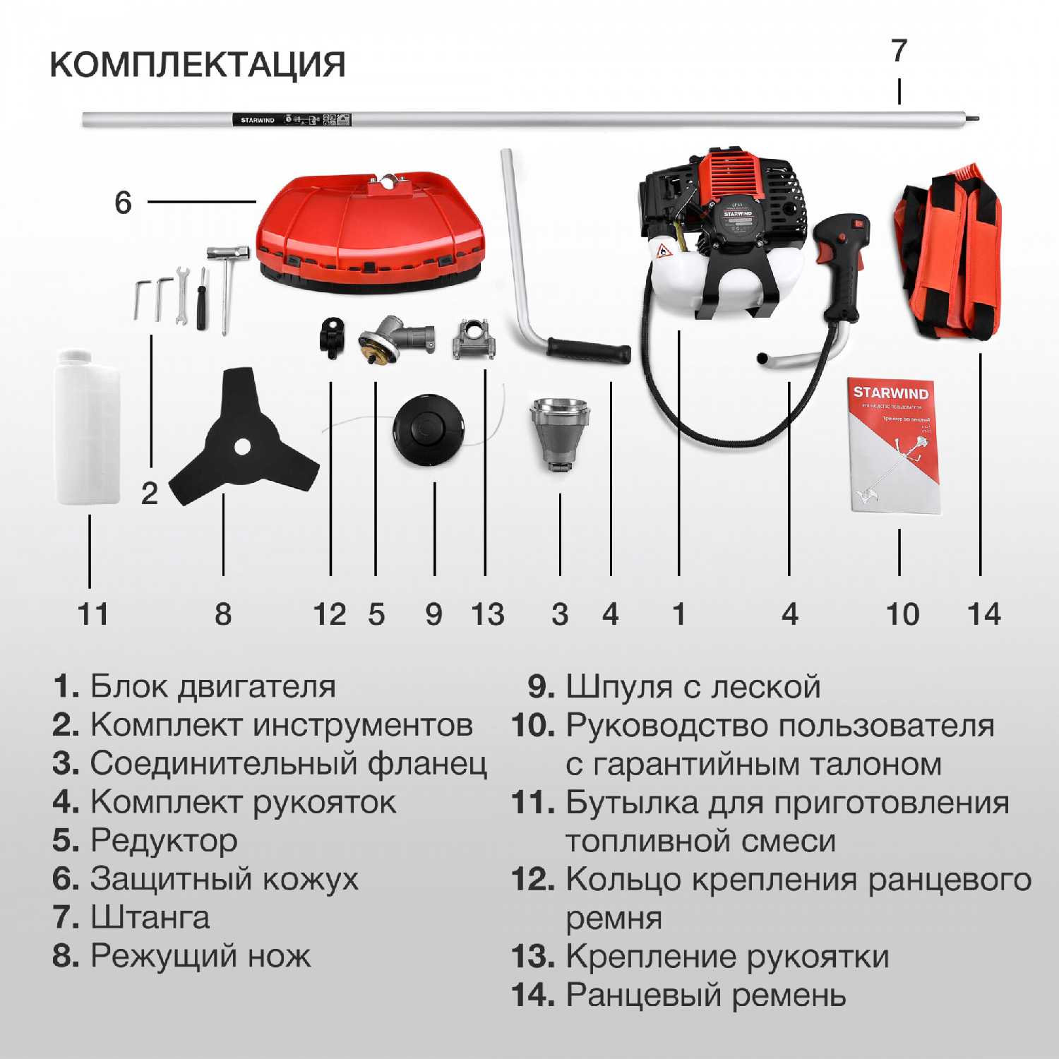 - Аппарат поставляется с всем необходимым: катушка с леской, режущий нож, ранцевый ремень, бутылка для приготовления топливной смеси.