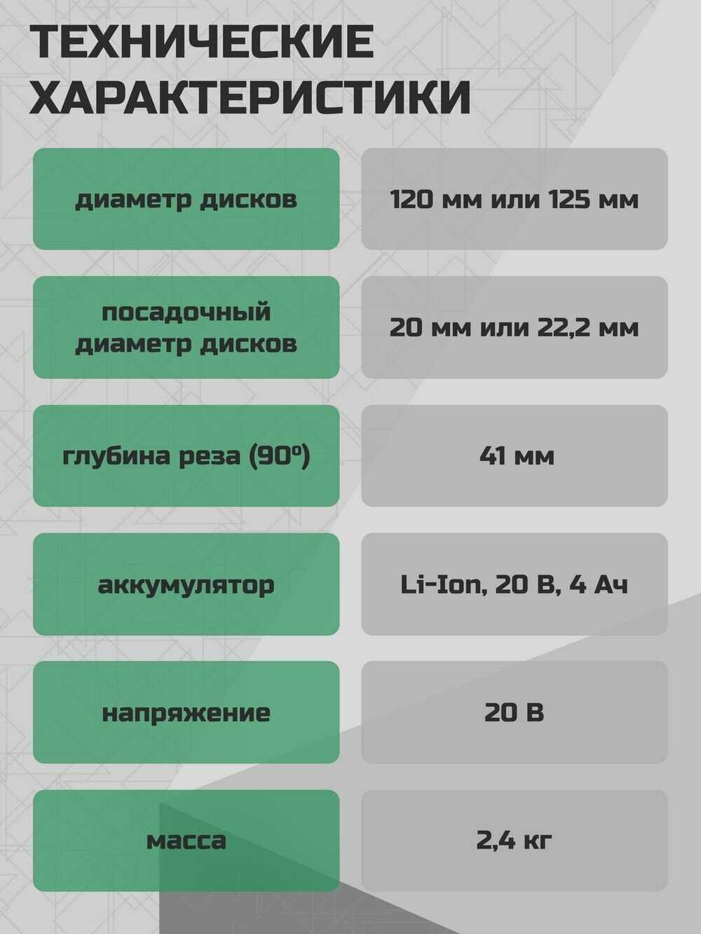 - напряжение аккумулятора: 20 В