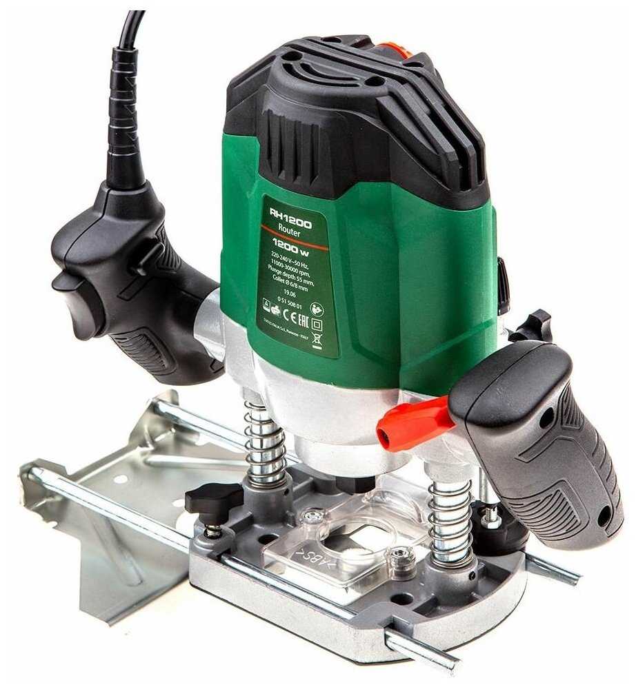 Фрезер имеет электронная регулировку скорости для работы с разными материалами. Есть линейка для выставления глубины фрезерования. Для быстрой замены фрез предусмотрена блокировка шпинделя. Адаптер для подключения пылесоса. Поворотный упор с восемью позициями. Выключатель с блокировкой случайного включения и удобные рукояти для комфортной работы. Есть копировальная втулка для фрезерования по шаблонам.