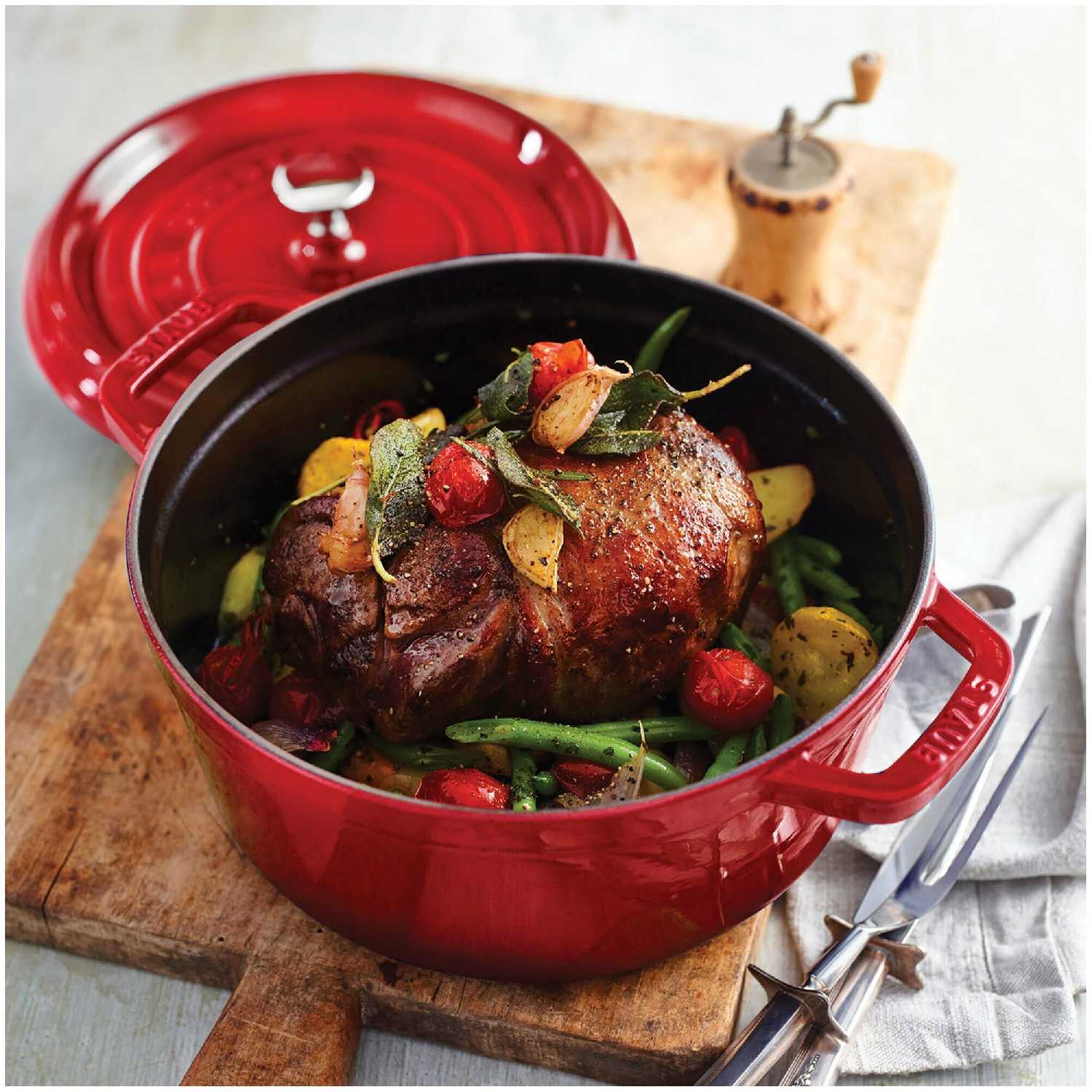 - + Это чугунный кокот стауб. Вечная классика. Хорошо прогревается, долго сохраняет тепло, что идеально доготавливает продукты. Черных цвет подчеркивает цвет блюда
