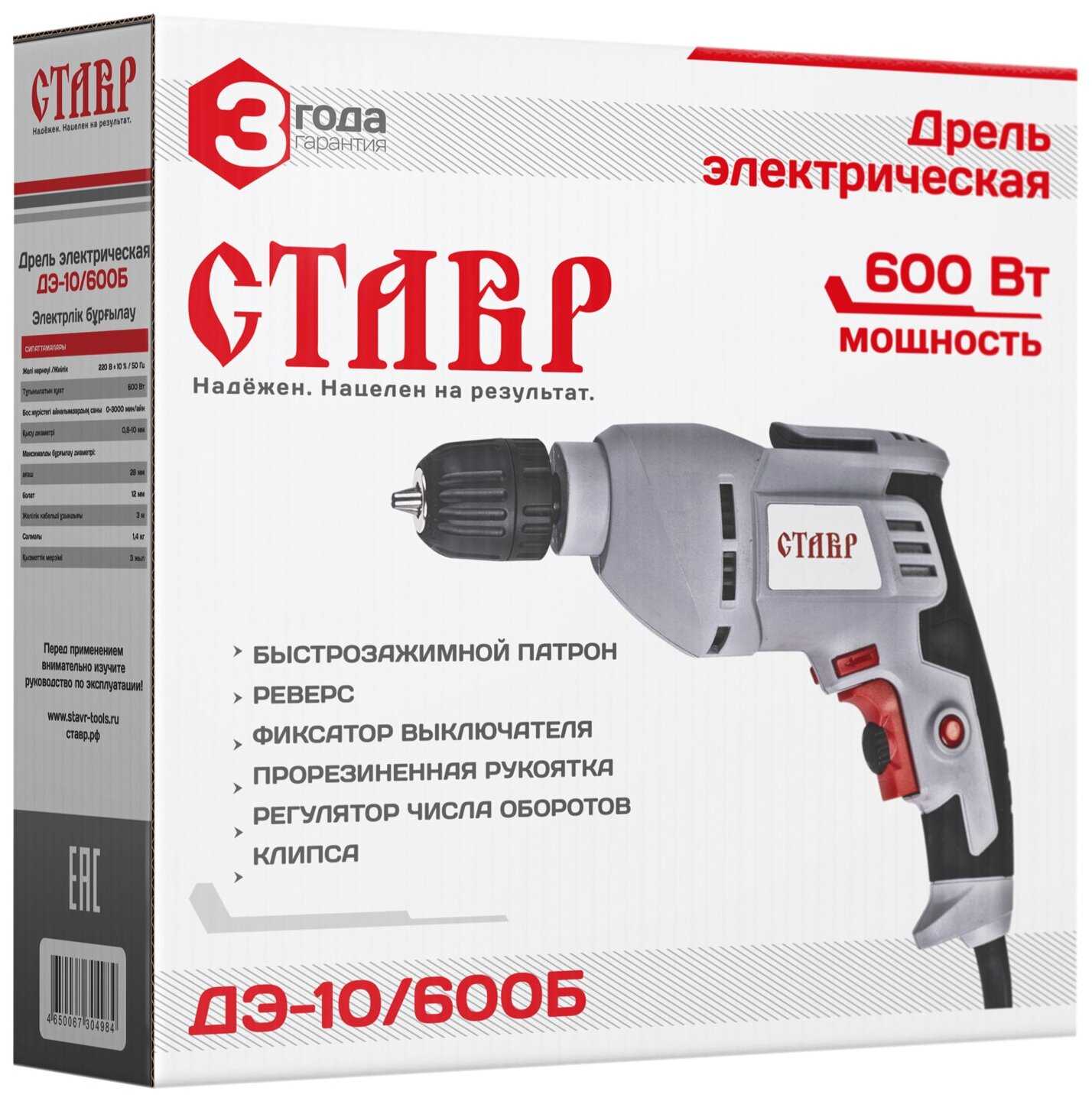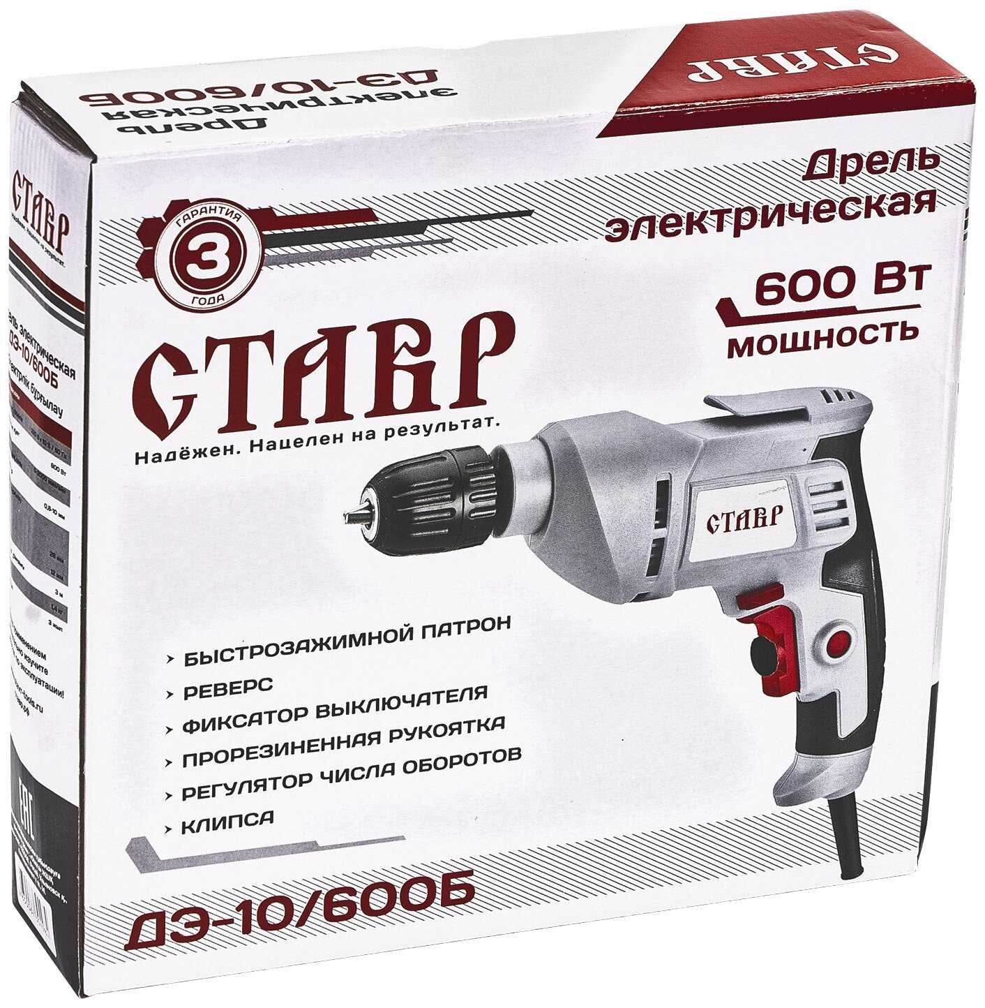 Комплектация : | Дрель электрическая СТАВР ДЭ-10/600Б |
