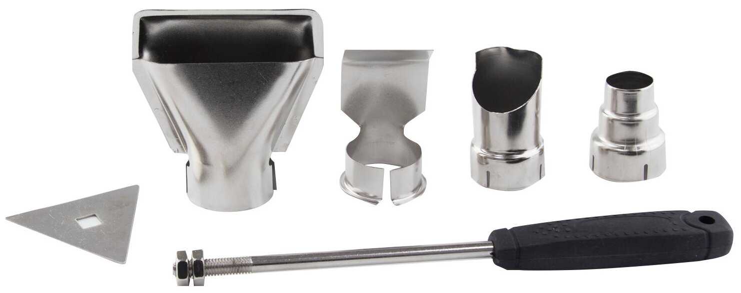 В комплекте поставляется 4 насадки разного диаметра, скребок с держателем и защитная рукоятка от тепла. Насадки эффективны для точечных работ (например, термоусадки проводов), но их крепления в кейсе ненадежны — они часто выпадают при переноске. Скребок удобен для удаления старых покрытий. -