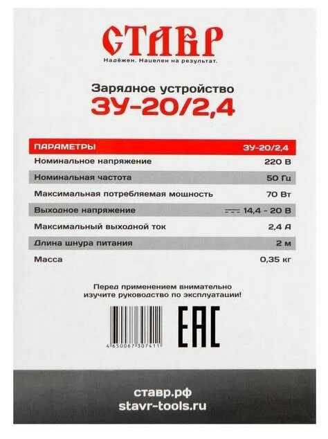 Характеристи СТАВР Зарядное устройство (ЗУ-20/2,4)