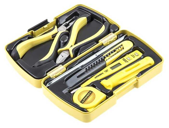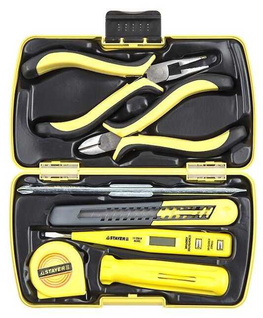 - + Всё находится в едином кейсе,рабочий пробник,пассатижи хорошо подогнаны.Ручки удобные.Самое то для ребёнка или для работ по слаботочке.