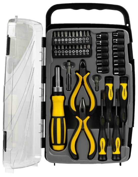 Аксессуары в комплекте : | бита-адаптер для торцевых головок, держатель для бит, нож, переходник для головок, рулетка, удлинитель для головок, шарнир карданный для головок |