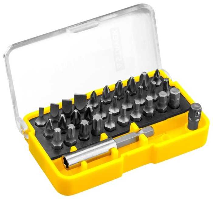 - + Высококачественная легированная хромомолибденовая сталь, точная геометрия шлицов, адаптер с магнитным держателем. Есть все ходовые размеры бит, компактный набор.
