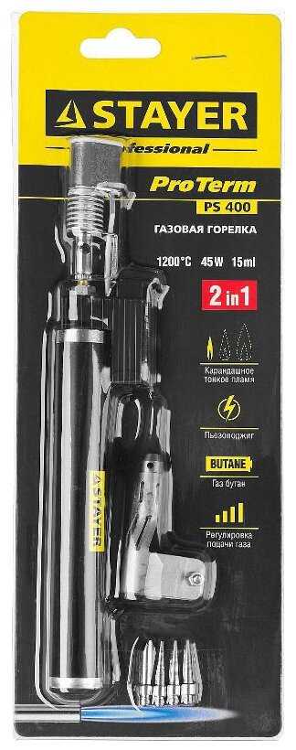 | Комплектация : | Набор 5-в-1 STAYER PS400 газовый паяльник, горелка, фен 55505-H6 |
