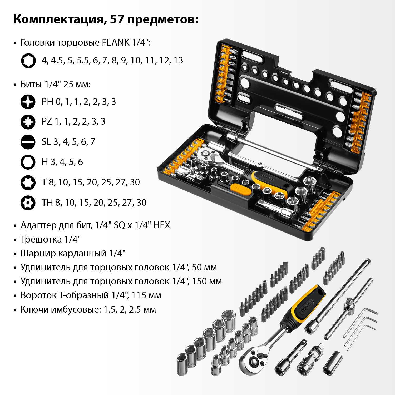 Аксессуары в комплекте : | бита-адаптер для торцевых головок, вороток для плашек, гибкий удлинитель для бит, гибкий удлинитель для головок, телескопический магнитный щуп, удлинитель для бит, удлинитель для головок, уровень, шарнир карданный для головок, штангенциркуль |