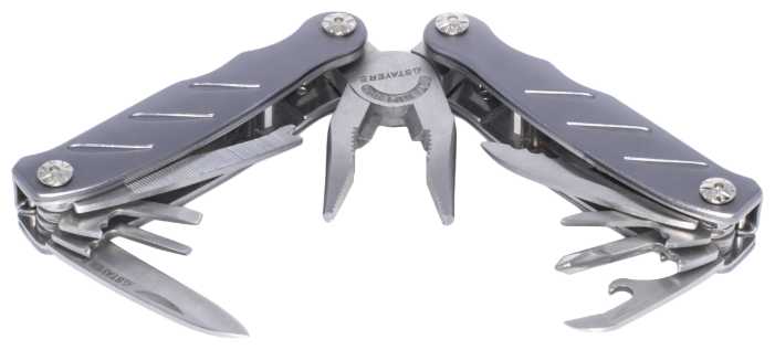 | Инструменты (функции) : | захват для гаек, консервный нож, кусачки, напильник, нож, отвертка, открывалка для бутылок, пассатижи, пила, пилка для ногтей, плоскогубцы |
